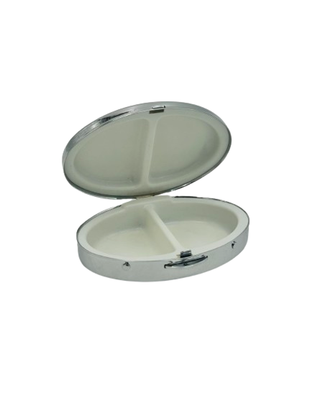 This box has a very nice quality feel about it, it has a glass mirror face on the inside of the lid and a partition to separate the contents.